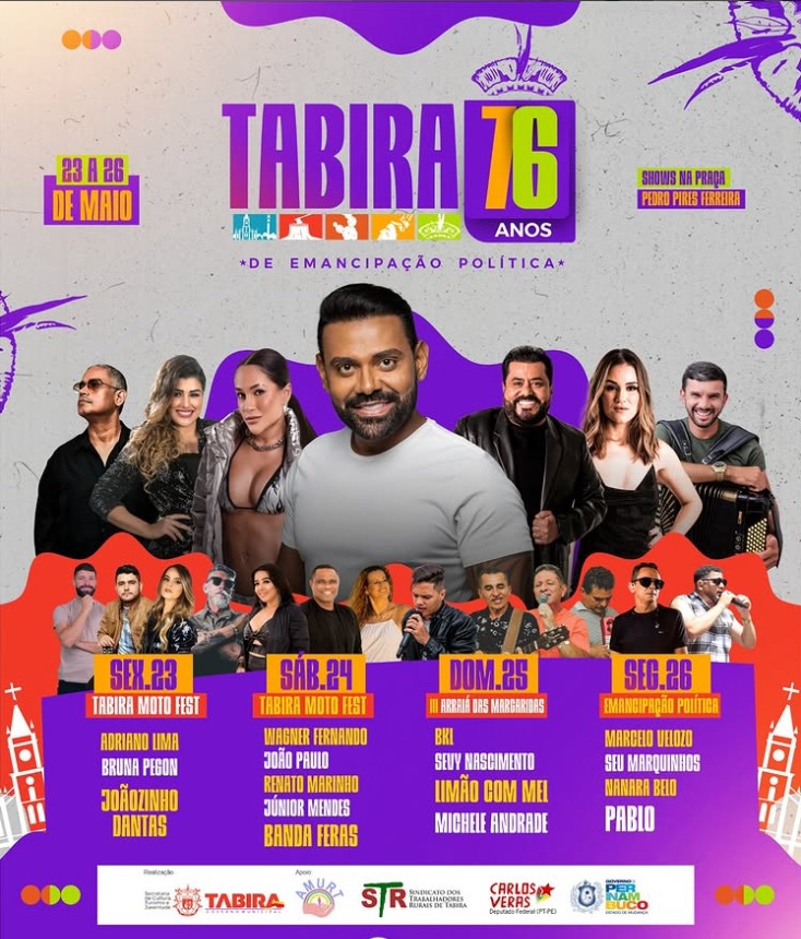 O prefeito de Tabira, Flávio Marques, anunciou oficialmente a programação da festa de 76 anos de emancipação política do município, prometendo um dos maiores eventos da história da cidade. Com atrações de peso como o cantor Pablo e a banda Limão com Mel, a comemoração vai movimentar Tabira entre os dias 23 e 27 de maio, reunindo cultura, tradição, música e motociclismo em uma grande celebração.