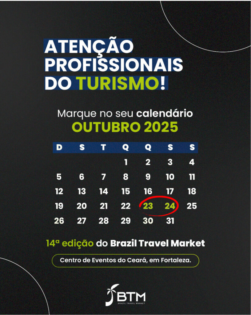 Por que ir ao BTM 2025? Postado em: Notícias O Brazil Travel Marketing (BTM) é o maior evento B2B do Brasil. O evento é realizado na capital do turismo nacional, a cidade de Fortaleza/CE e no melhor Centro de Convenções do Nordeste brasileiro. Agora agende e participe. Ou você vai perder? Compartilhe isso: Compartilhar no Facebook(abre em nova janela) Facebook Compartilhar no X(abre em nova janela) 18+ Curtir isso:Curtir Carregando... Compartilhe essa notícia:
