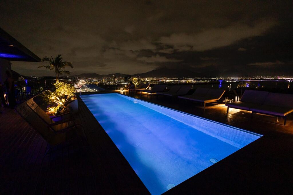 Na parte frontal do rooftop, foram criados novos lounges para conectar hóspedes e grupos, favorecendo encontros, eventos e momentos de convivência. Já a área da piscina ganhou nova atmosfera com espreguiçadeiras substituídas e a chegada das cadeiras Skia, da MAC, trazendo leveza e um visual à beira-mar. Palmeiras, bromélias e espécies tropicais reforçam a identidade solar da Barra.
